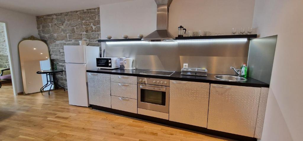 Hästi varustatud köögis on pliit, külmik, ahi ja mikrolaineahi.